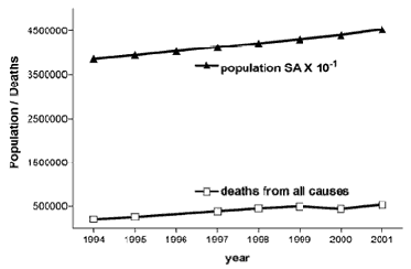 5 South Africa is the richest country in sub-Saharan Africa and has the most reliable statistics on the continent. Statistics South Africa (Stats SA) reports a constant growth in the population of South Africa from 38 million in 1994 to 43 million in 2001. [46,47] Furthermore, the rise in the number of deaths from all causes during the same period was also constant, growing as the population grows—but no faster (Fig. 3).