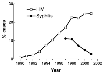 Western Cape, on the other hand, had the highest rate of syphilis in 2000 but the lowest HIV prevalence. Northern Cape had the highest rate of syphilis in 2001 but the third lowest prevalence of HIV antibodies in that year. Paradoxically, then, there is an inverse geographical correlation between syphilis and HIV (Fig. 4) although both are said to be transmitted by heterosexual intercourse. An even more extraordinary result is the divergence over time between an increasing prevalence of antibodies to HIV and a declining rate of syphilis (Fig. 5). This is also difficult to understand given the assumption that both are sexually transmitted.